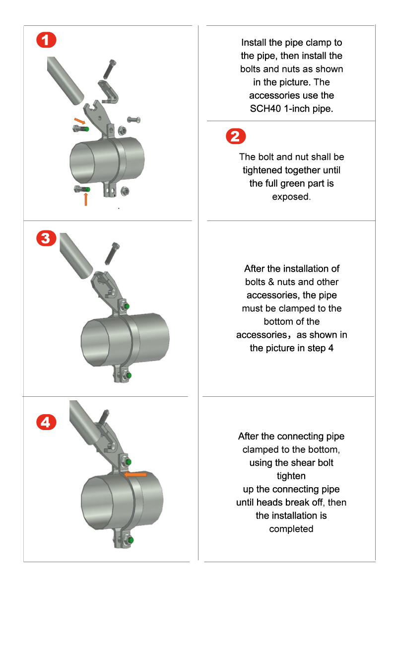 • Install the pipe clamp to the pipe, then install the bolts and nuts as the shown picture.