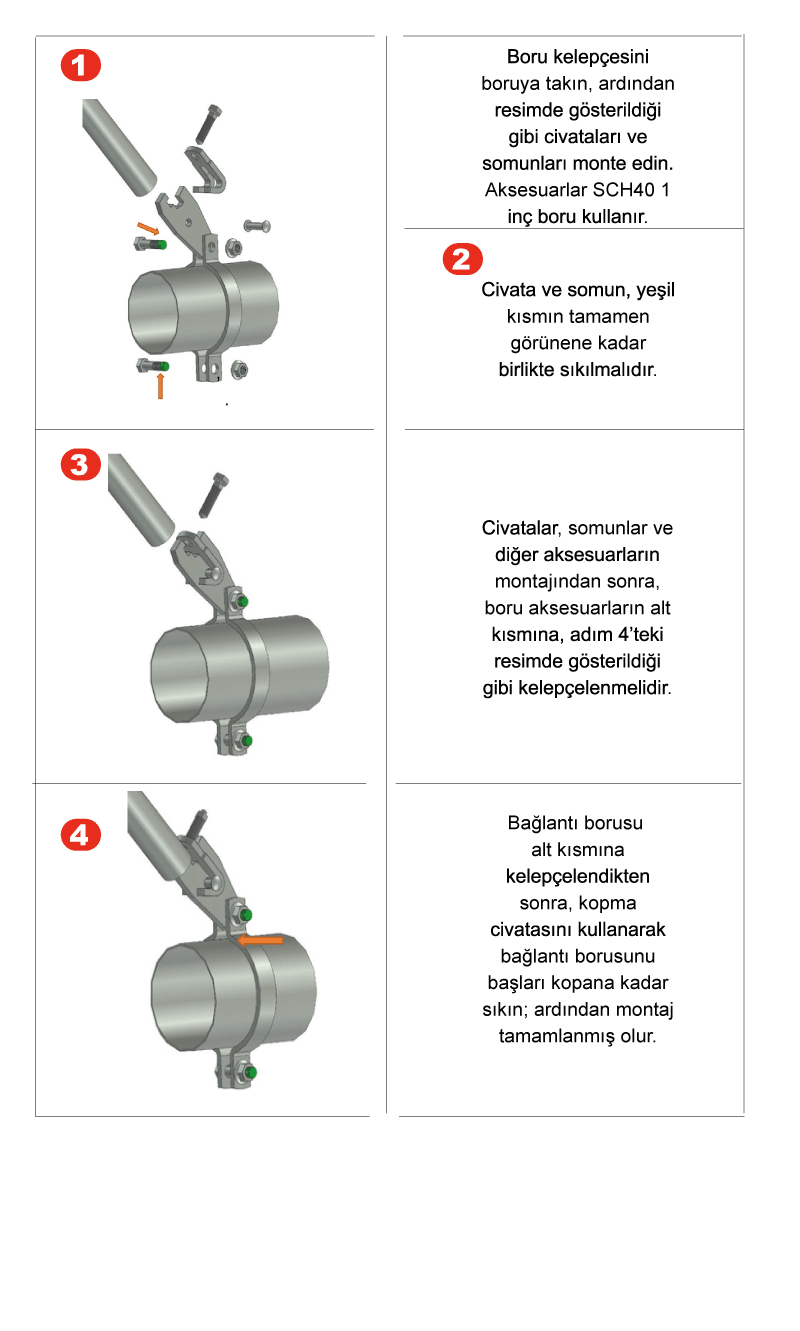 • Cıvata, somun ve diğer bağlantı elemanlarının montajından sonra, boru bu elemanların alt kısmına sıkıca sabitlenmelidir.